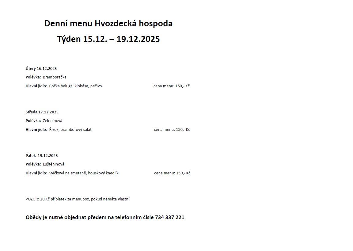 Nabídka denního menu Hvozdecké hospody na příští týden viz níže. Obědy je nutné objednat předem na telefonním čísle 734 337 221 a to nejpozději do neděle 14.12.2025.