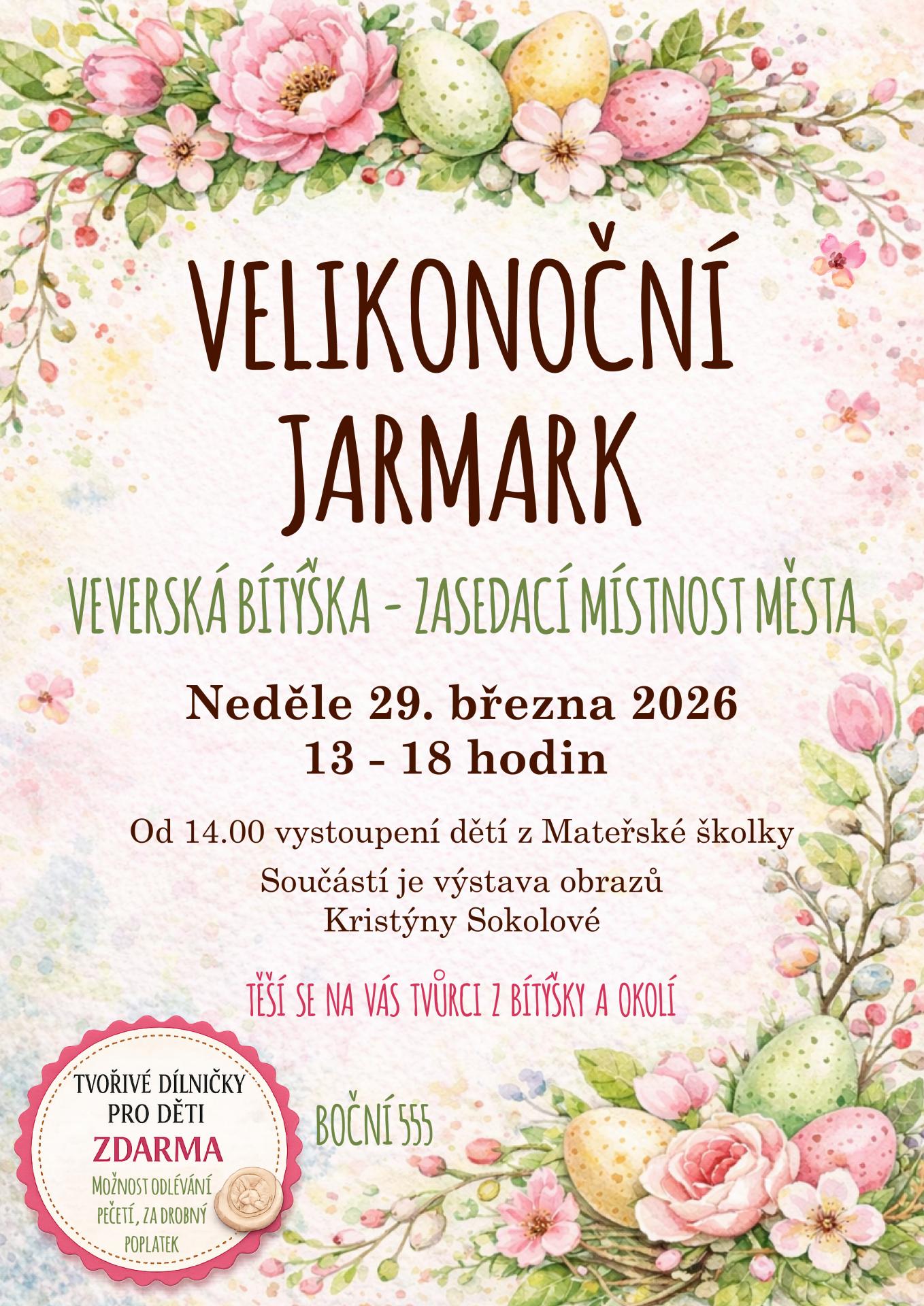 V neděli 29. března se ve Veverské Bítýšce uskuteční velikonoční jarmark, kde své výrobky představí tvůrci z Veverské Bítýšky i okolí. Součástí akce je také vystouepní dětí z MŠ a výstava obrazů Kristýny Sokolové.